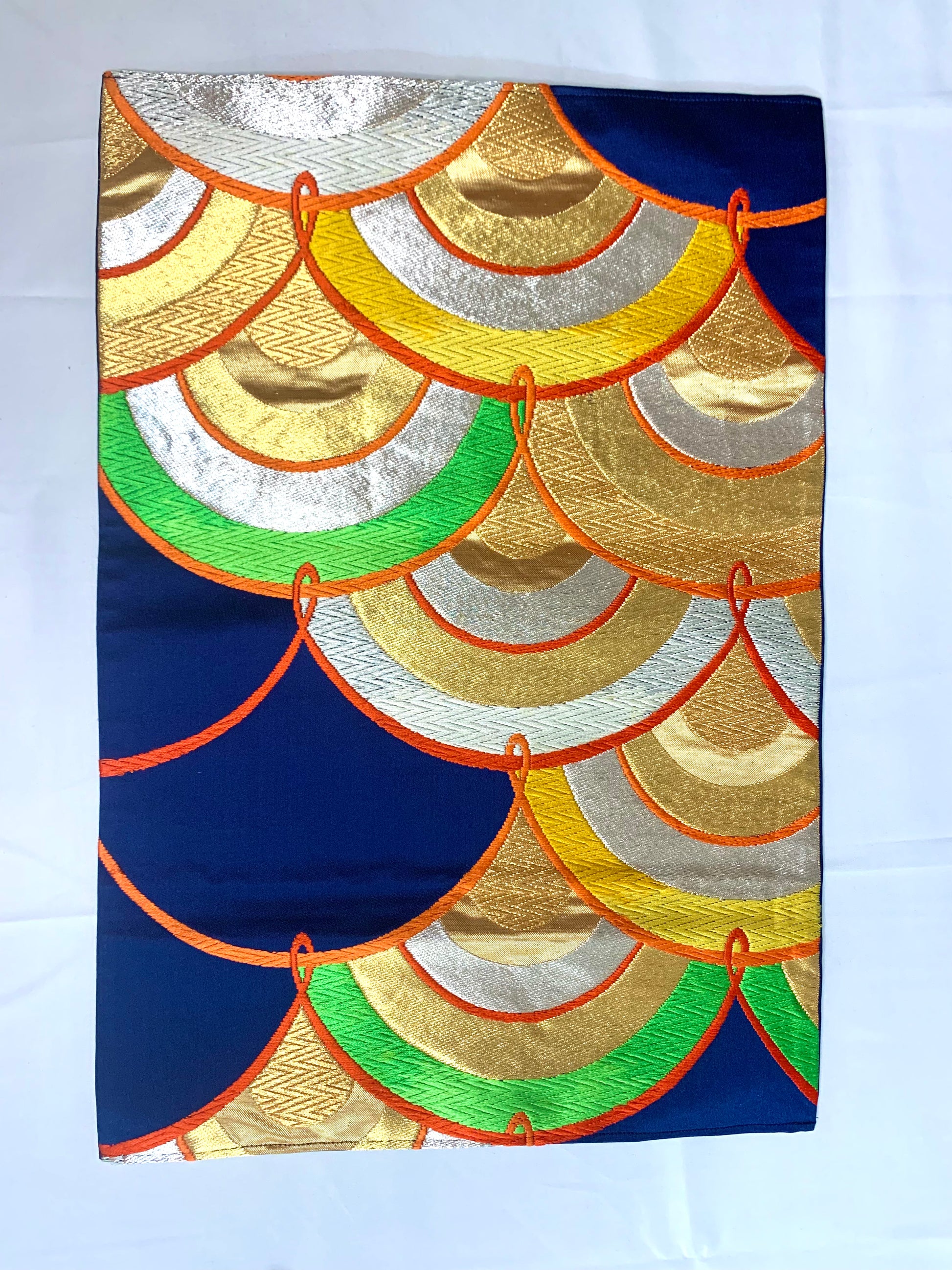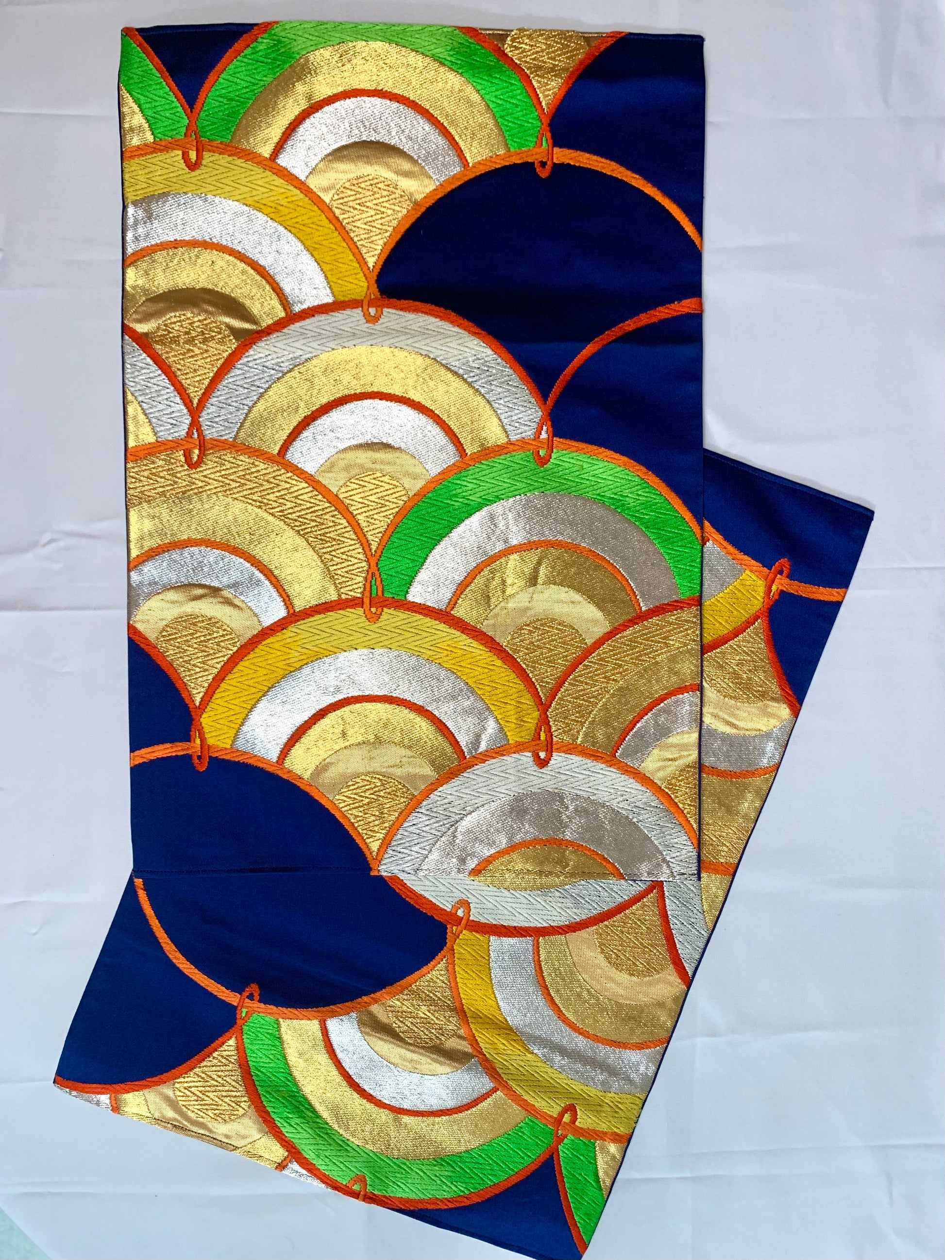 こちらの帯の生地を使用したランチョンマットは、ブルー柄の青海波のおしゃれなデザインで、テーブルに華やかさを加えます。高級感のあるデザインと実用性を兼ね備えた、帯生地のランチョンマットを是非お試しください。